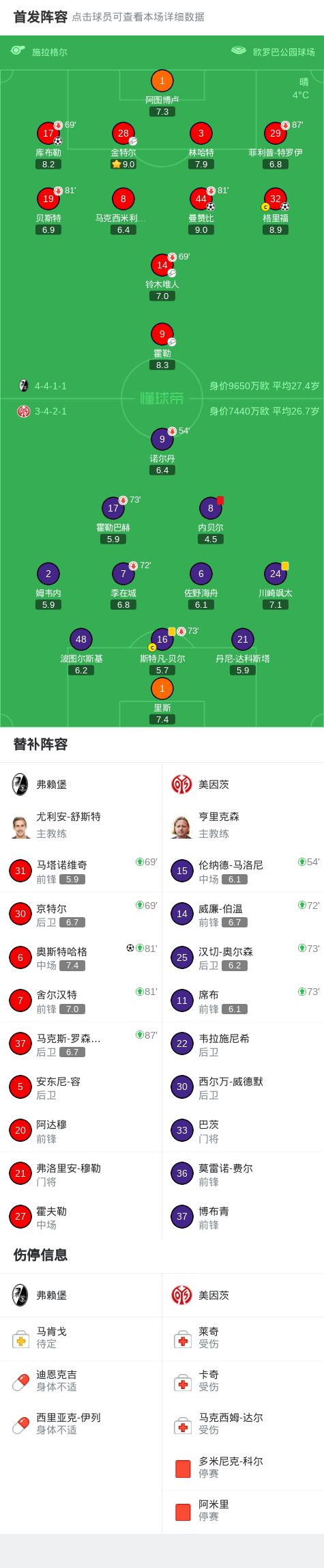 弗赖堡4-0大胜美因茨,奥斯特哈格破门,曼赞比建功